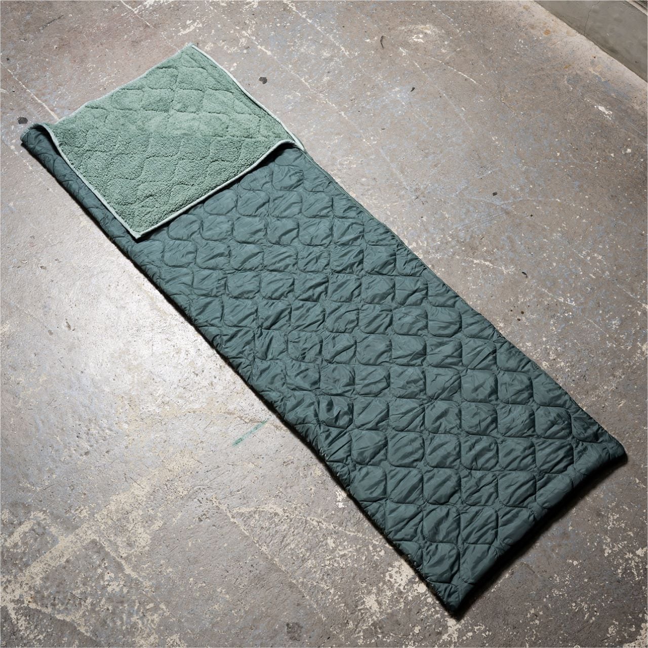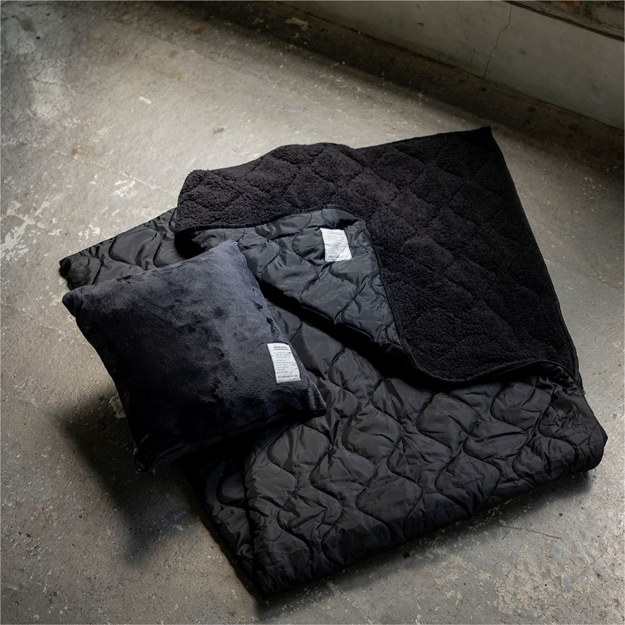 広げてブランケット。半分に畳んでファスナーを閉じれば寝袋に。さらに畳んでパッケージカバーに収納すればクッションに。綿入りのミリタリーキルティングの表地と裏地はボア素材の極暖仕様。自宅や屋外、車中泊にも使える3WAY便利アイテム。専用ミルスペック付き。