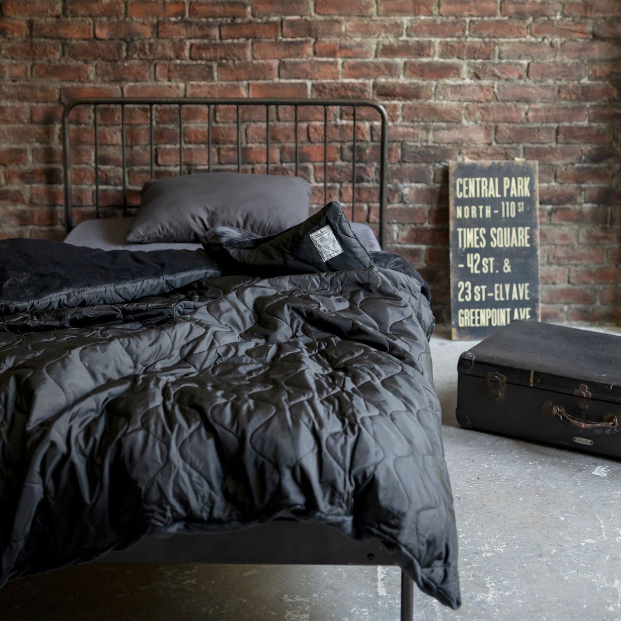 綿入りのミリタリーキルティングの表地と裏地は滑らかタッチのフランネル素材。布団を入れなくてもブランケットとして使えるくらいの極暖仕様。ベッドルームの雰囲気が一気にミリタリー感満載に生まれ変わるマストアイテム。専用ミルスペック付き。