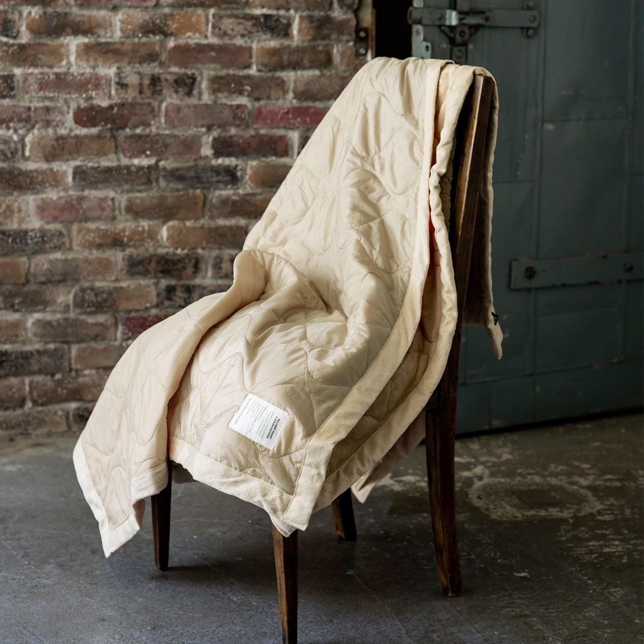 取り外し可能な二枚仕立てのハーフケット。表側のケットは綿入りミリタリーキルティングに裏地にもこだわりカラー素材を使用。裏側のケットは表地に滑らかフランネル素材、裏地はボア素材のあったか仕様。四隅、両サイドに付いたドット釦を外せば二枚のケットとしてシェア使いもできる。シチュエーションを選ばず使える極暖ハーフケット。専用ミルスペック付き。